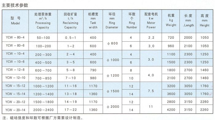 YCW系列無水卸料回收機(jī)是我公司根據(jù)國外經(jīng)驗(yàn)研制開發(fā)的一種新型產(chǎn)品。該機(jī)磁系采用一組由外裸磁塊鑲嵌而成的磁環(huán),按照一定間隙排列而成。該磁系直接作用磁性物料,磁場強(qiáng)度高,作用梯度大,回收率可高達(dá)85%~95%,特別是采用V型刮板,借助磁性物料自身重量,實(shí)現(xiàn)了無水或少水一次卸料,該機(jī)廣泛應(yīng)用于冶金、礦山、有色金屬、黃金、建材、電力、煤炭等行業(yè)選廠及洗煤廠、鋼鐵廠(鋼渣)燒結(jié)廠等所排廢棄漿體中磁性物的回收與開發(fā)利用。