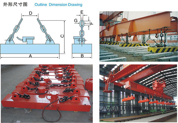 本系列產品是專為吊運中、厚鋼板而設計,磁路設計,適合于中厚板廠、造船廠、機械制造廠,用戶可根據自身要求選用單張系列(300型)、少張數系列(350型)、多張數系列(400型),少張數型和多張數型可采用調磁控制方式,能保證起吊一張或多張鋼板并單張放料,由于長鋼板在搬運過程中容易產生彎曲變形,故選用電磁鐵時宜多臺聯用。對于長中厚板(6mm-32mm)電磁鐵間距多取3-4m,兩端外伸部分的長度可小于或等于其間距的二分之一,作業時鋼板彎曲變形將影響安全搬運,選用時應注意電磁鐵的長度與鋼板厚度對應的搬運寬度的對應參數,不宜超過,尤其是吸吊多張鋼板的情況。