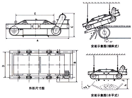 RCDF系列油冷自卸式電磁除鐵器外形尺寸及安裝示意圖: